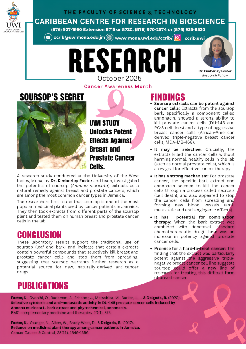 Today, The Caribbean Centre for Research in Bioscience (CCRiB), a research centre of the Faculty of Science and Technology at the University of the West Indies, highlights research work done by Dr. Kimberley Foster (Research Fellow) and team. The research demonstrated the potency of Annona muricata, the Soursop plant (natural products) in killing breast and prostate cancer cells and stopping them from spreading to surrounding tissues.