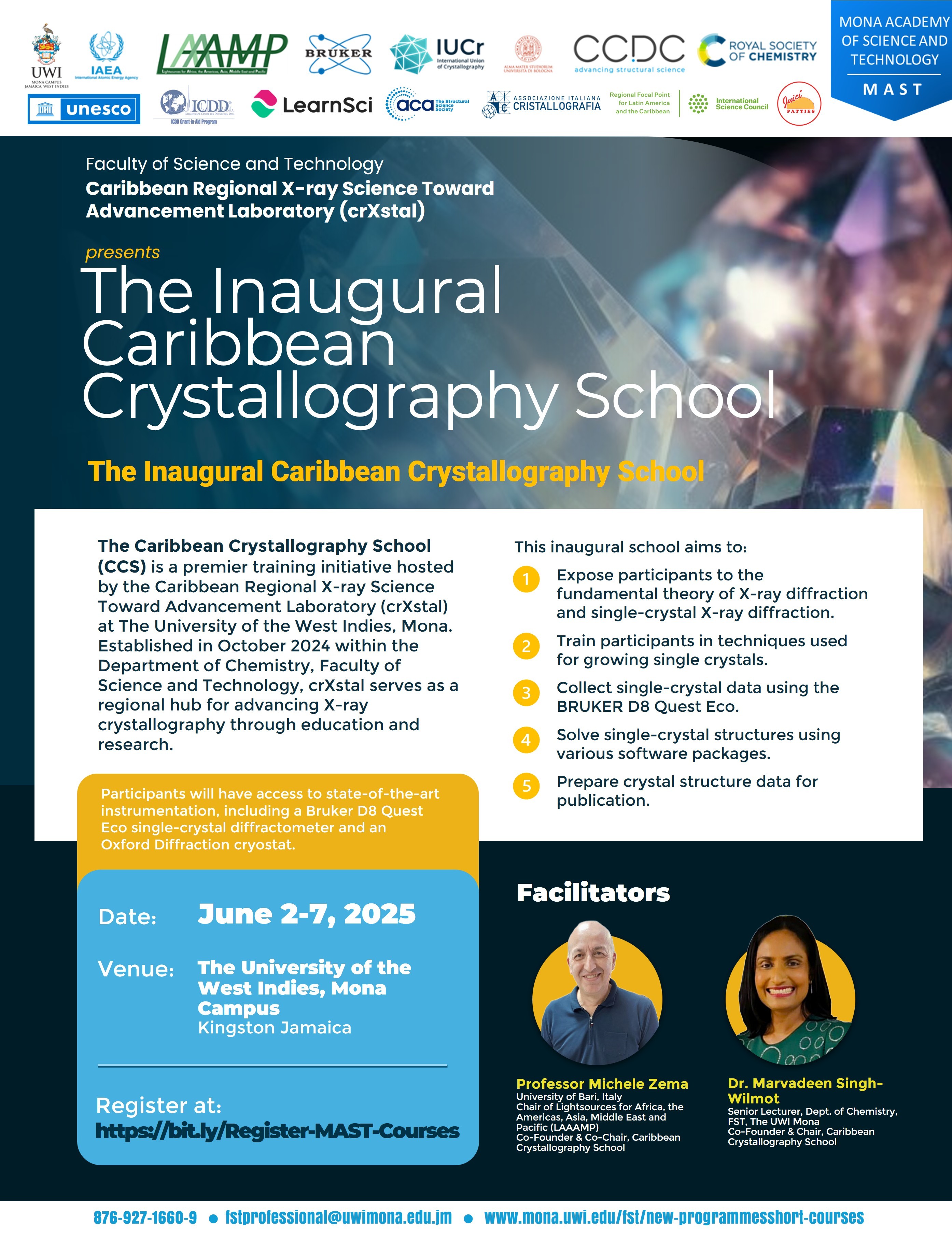 Overview: The Caribbean Regional X-ray Science Toward Advancement Laboratory (crXstal) was established in October 2024 in the Department of Chemistry, Faculty of Science and Technology at The University of the West Indies, Mona, Jamaica, as a regional hub dedicated to capacity building in X-ray crystallography through education and research. Its primary objectives are: 1) to teach X-ray crystallography through short courses, training schools and outreach activities aimed at popularizing the technique especially among youth; 2) to facilitate cutting-edge research that address regional challenges and position the Caribbean as a global leader in innovation and 3) crXstal is presently equipped with a Bruker D8 Quest Eco single-crystal diffractometer and an Oxford Diffraction cryostat. Topics to be covered: Symmetry in crystals. Lattices, unit cells, point groups and space groups. Diffraction of X-rays by crystals. Bragg’s Law. The reciprocal lattice and the Ewald Sphere. Systematic absences, structure factors and electron densities. Use of the International Tables for Crystallography Vol. A. Crystal growth techniques. Crystal selection and mounting. Data collection and reduction. Structure solution and refinement. Structural analysis and reporting – molecular graphics and the CIF file. Use of various software packages for structure solution, refinement and display. Structure validation and publication. The Cambridge Structural Database. Introduction to crystallography using synchrotron radiation. Examples of applications of single crystal X-ray diffraction. The programme will include hands-on sessions on the Bruker D8 ECO Quest so students will have the opportunity to collect their own data and solve the structures. Target Audience: Postgraduate students and researchers/ faculty members from any university, and Industry persons in a STEM discipline. Pre-course Requirement: A voluntary, online two-day pre-course will be held one week before the start of the school with the aim of levelling the background. It will cover basic principles of symmetry and linear algebra with exercises. Modality: Face-to-Face Cost: USD 700 (excludes accommodation, airfare, and local travel to and from airport) Lecturers: