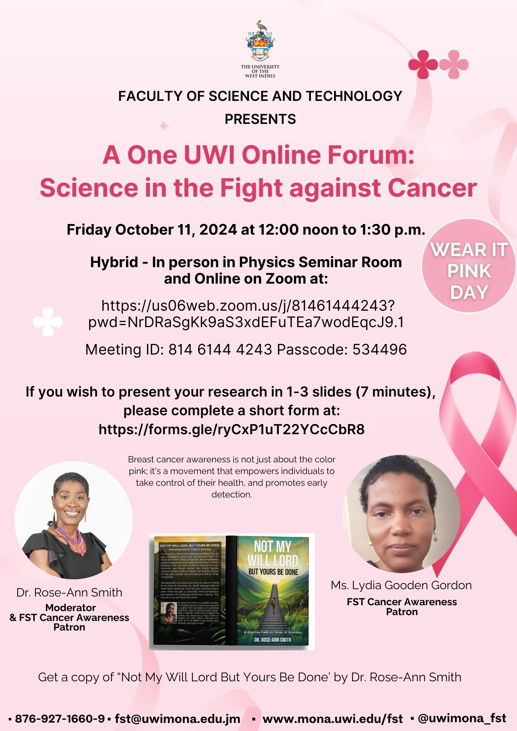 October is Breast Cancer Awareness Month! Join FST Cancer Awareness Patrons Dr. Rose-Ann Smith and Mrs. Lydia Gooden Gordon, along with researchers, in the fight against breast cancer at the “One UWI Online Forum: Science in the Fight Against Cancer.” This event will take place on October 11, 2024, at 12:00 PM via Zoom. Don’t miss the opportunity to learn about the innovative cancer research being conducted at The UWI!