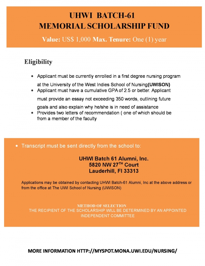 Applications may be obtained by contacting UHWI Batch-61 Alumni, Inc at the above address or from the office at The UWI School of Nursing (UWISON)