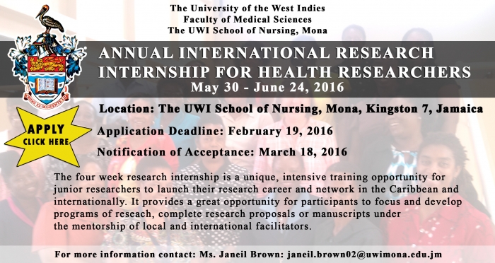 · The UWI School of Nursing, Mona will host the Annual Nursing and Midwifery Research Conference on Thursday, May 26 and Friday May 27, 2016. Interns are encouraged to submit abstracts and attend the conference. Conference registration is not included in the internship package. For information on the conference and call for abstracts go to: http://www.mona.uwi.edu/nursing/sites/default/files/nursing/uploads/call_for_abstracts_2015.pdf